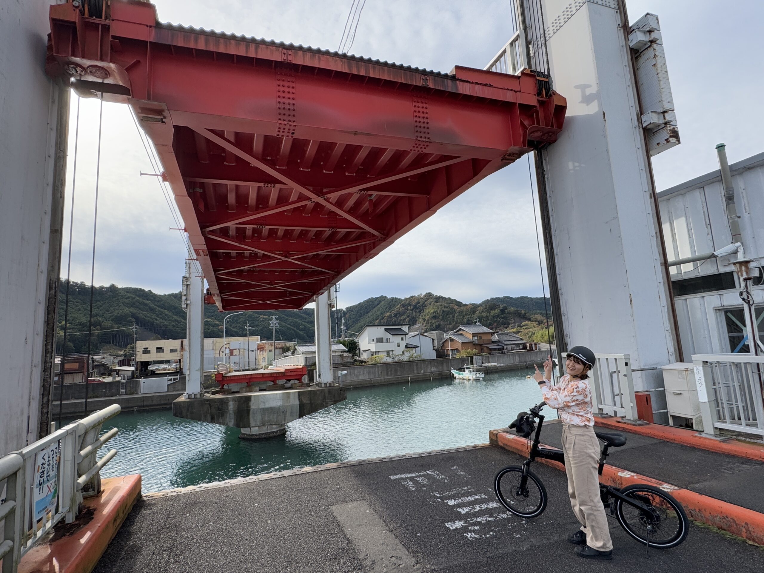 江ノ浦橋は船がくると橋の下を通過させるために上下する昇降橋。通常時は自転車は通行できます。見られた人には幸運が訪れるかも!?